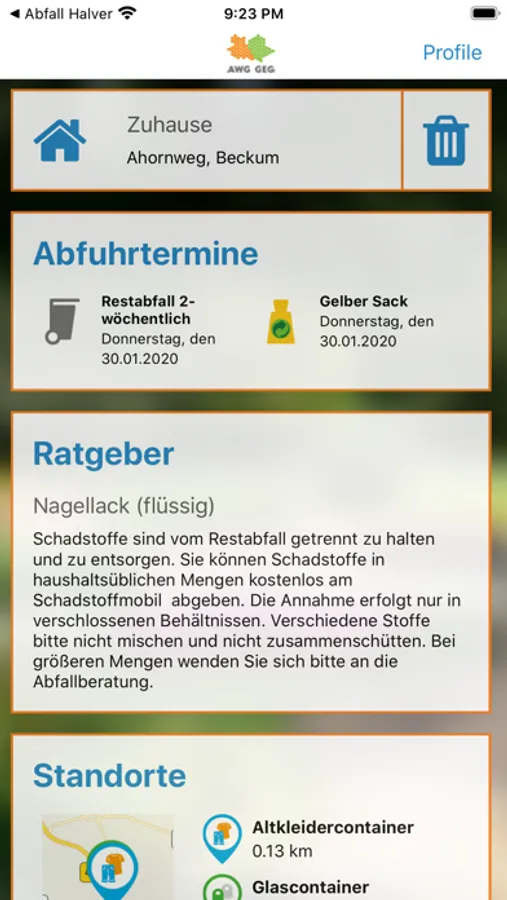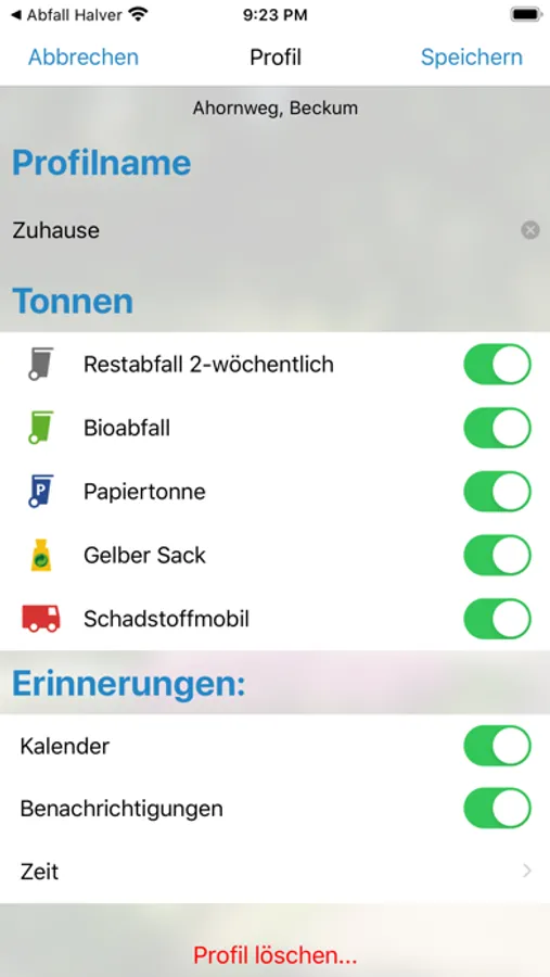 Im Profil wählen Sie Ihren persönlichen Standort aus. Über einen Schieberegler stellen Sie ein, über welchen Abholtermin eines bestimmten Wertstoffes Sie informiert werden möchten.