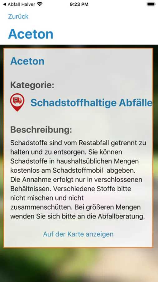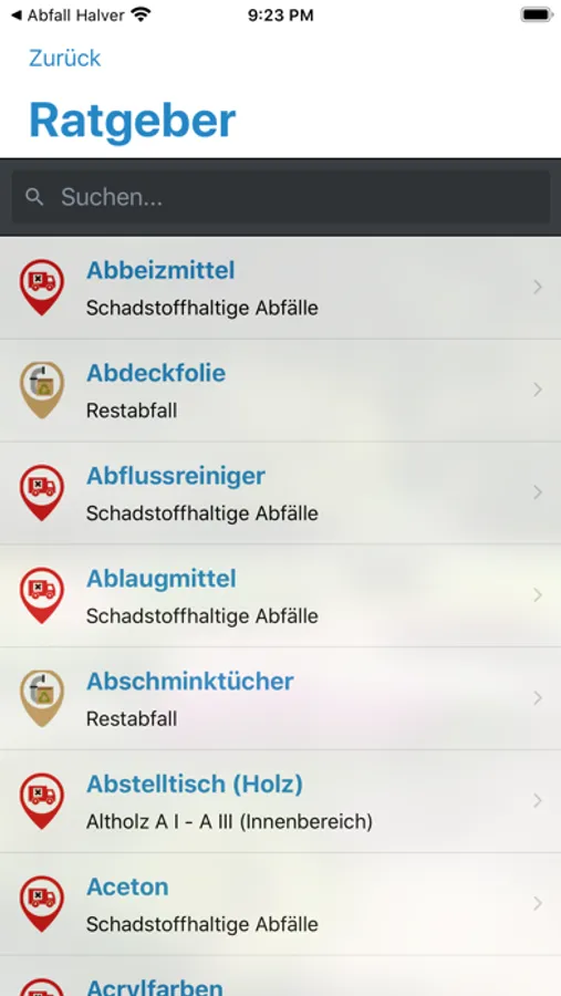 • ein Abfall-ABC, mit dem Sie sich über die Entsorgung ganz bestimmter Wertstoffe informieren können. Zudem wird auf den richtigen Entsorgungsstandort verwiesen.