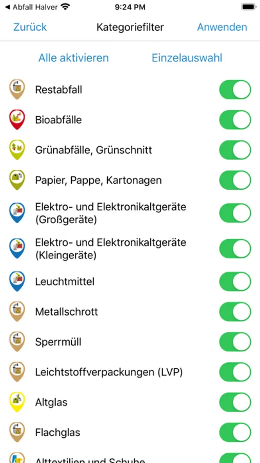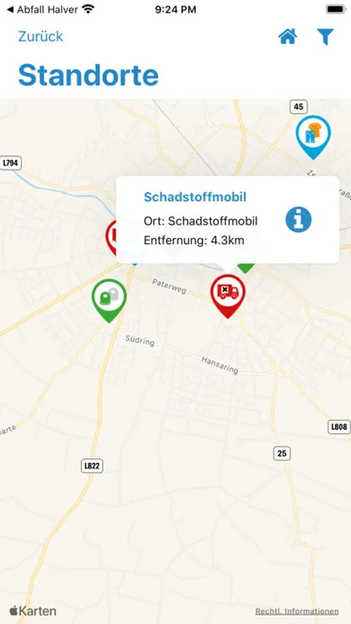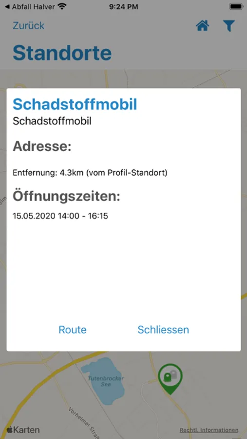 • eine Übersicht aller Entsorgungsstandorte (Glascontainer, Wertstoffhof, etc.) mit Öffnungszeiten und einer Routingfunktion