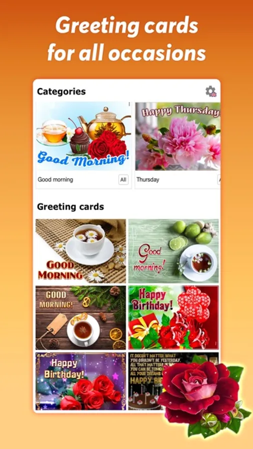 We have more than 20 categories and more than 17,000 wishes in our collection, and we regularly add new greeting cards! We have the best pictures and GIFs with flowers. If you want to send a picture or GIF to your best friend, or just wish a good morning - send greeting card for free in one click.