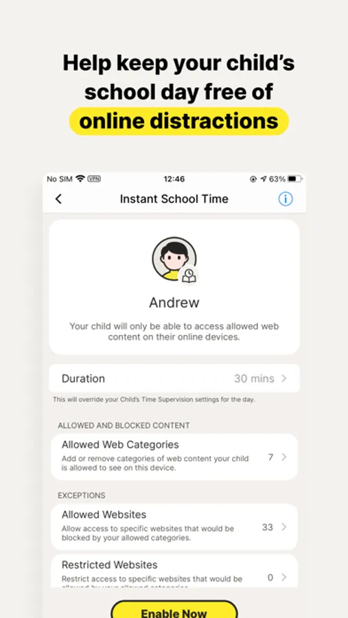 Remote learning requires the internet, so pausing the internet on your child’s device is not an option. Manage content access to relevant categories and websites to help your child maintain focus while school’s in session.
