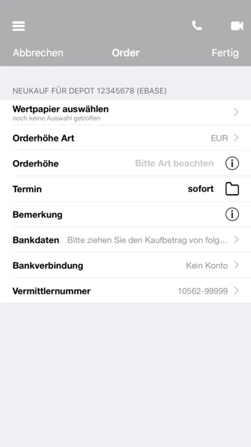 - Einreichung von Orderaufträgen direkt über die App, Bestätigung per Kennwort oder digitaler Unterschrift