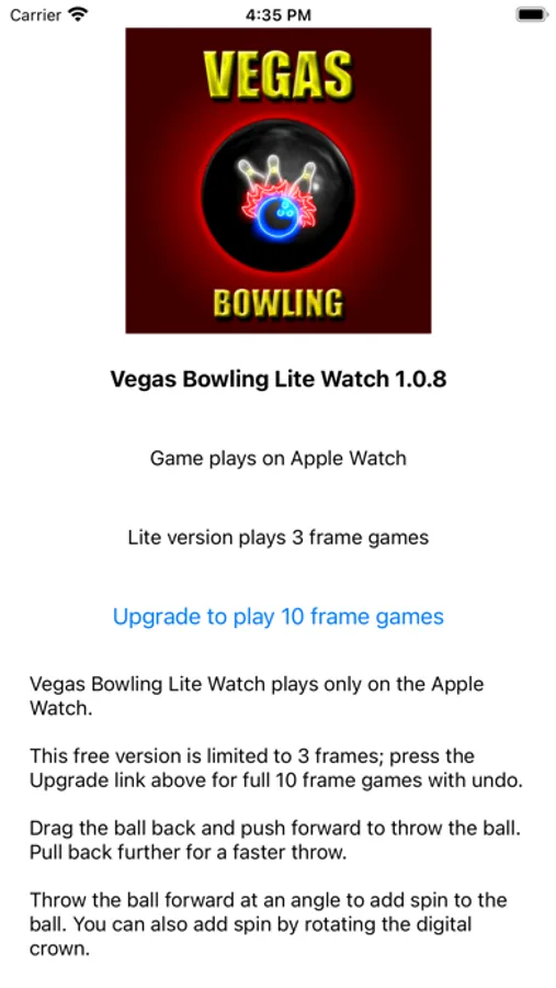 Note: Vegas Bowling Lite Watch plays on the Apple Watch. This free version plays shortened 3 frame games; upgrade to the full version for 10 frame games.