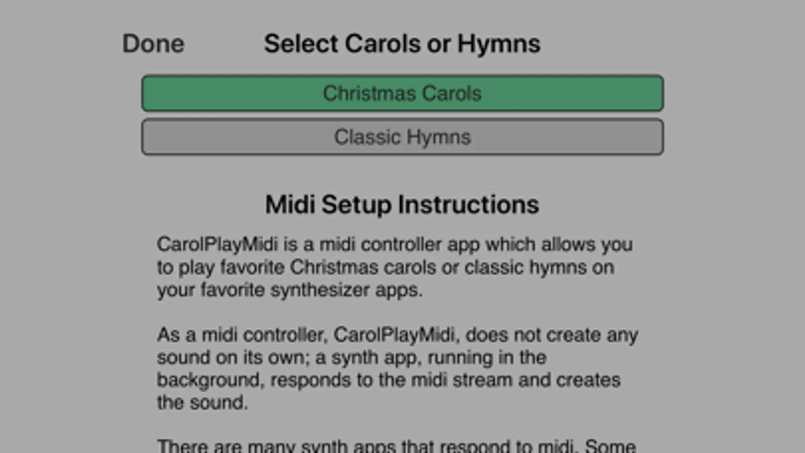 There are many synthesizer apps which can be used to create the sound. Setup instructions are found on the CarolPlayMidi "Setup" page, and at the support website.