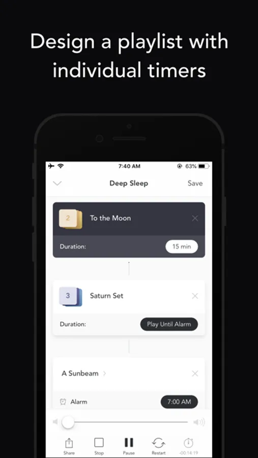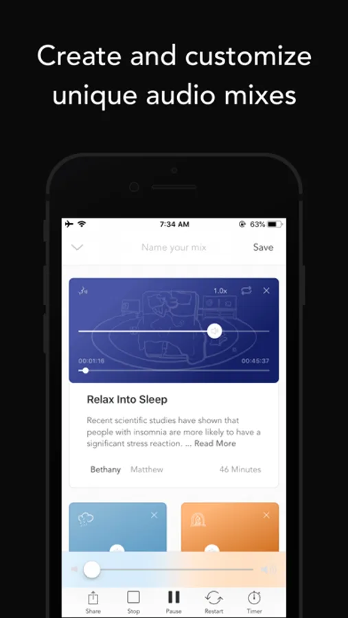Create your perfect list of audio mixes with individual timers or alarms. Mixes will transition smoothly one after another with seamless crossfades.