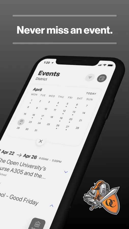 The event section shows a list of events throughout the district. Users can add an event to their calendar to share the event with friends and family with one tap.