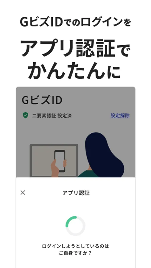 GビズIDマイページおよびGビズIDと連携した行政システムへのログイン時、「ID/パスワード」入力による認証に加え、本アプリによる簡単操作により、二要素認証を行い、セキュリティを強化できます。