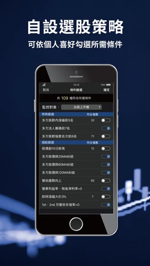 【選股策略】可依個人喜好勾選所需選股條件。