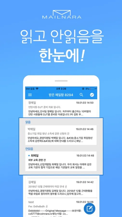 메일나라 앱 V1은 웹 메일에서 제공하는 다양한 기능을 그대로 사용하였다면 메일나라 앱 V2는 메일 회신, 전달, 답장 등 메일 관리에 충실한 애플리케이션입니다.