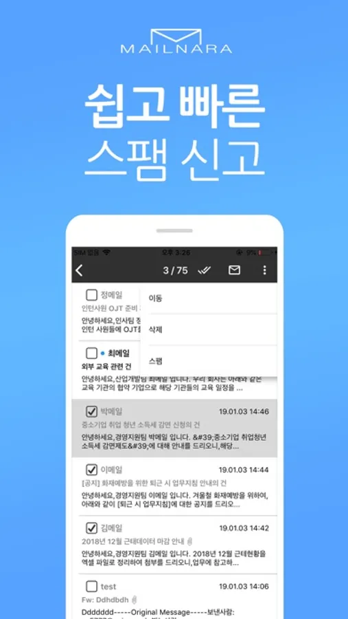 메일나라 V2는 스팸 신고할 메일은 선택하고 스팸 신고를 선택하면 바로 스팸 적용되며, 스팸 설정은 앱환경설정에서 확인하고 수정 및 관리가 가능하도록 기능을 제공하고 있습니다.