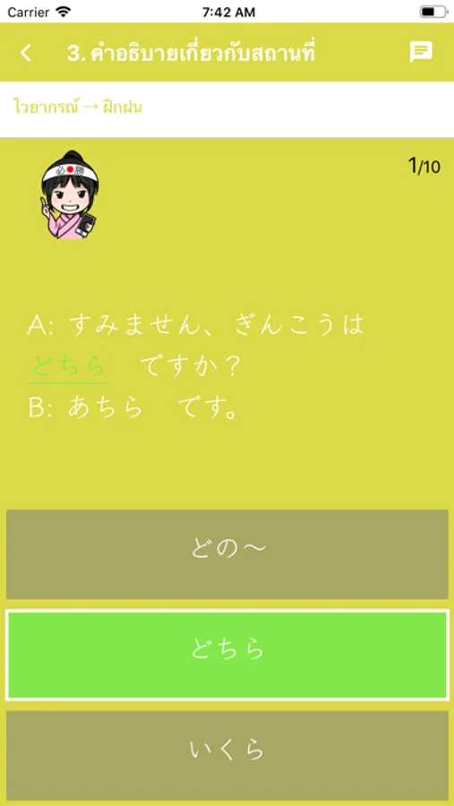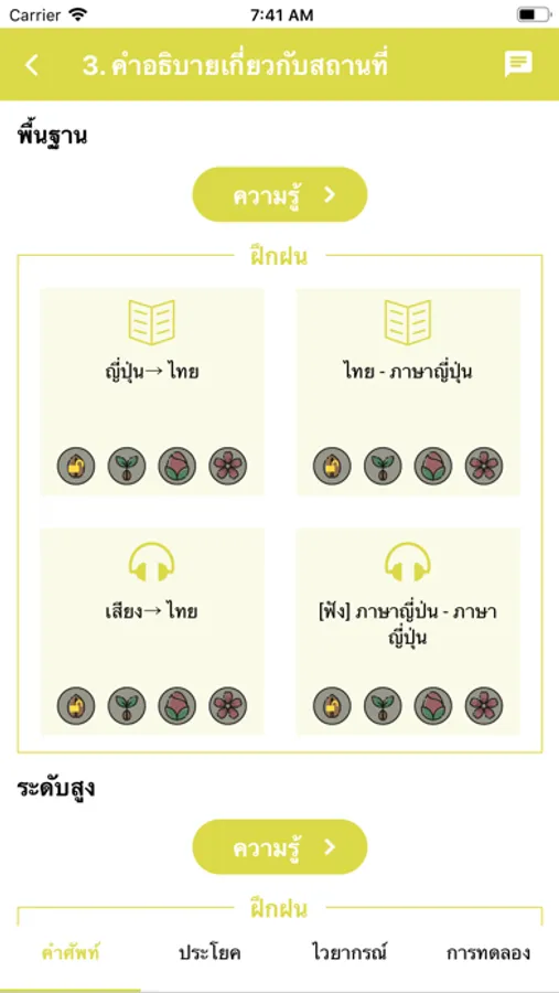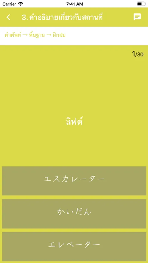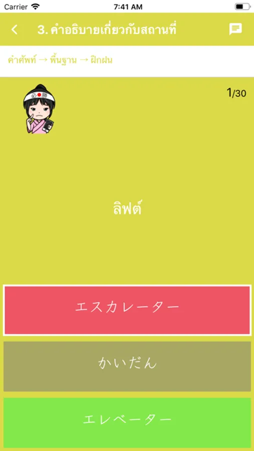 3. การทดสอบแบบ 3 ตัวเลือก: สามารถเลือกภาษาญี่ปุ่นเป็นภาษาไทย / อังกฤษจากภาษาจีน / ภาษาอังกฤษเป็นภาษาญี่ปุ่นและภาษาญี่ปุ่นในภาษาไทย / ภาษาอังกฤษได้ด้วยการทดสอบ 3 ทางเลือก