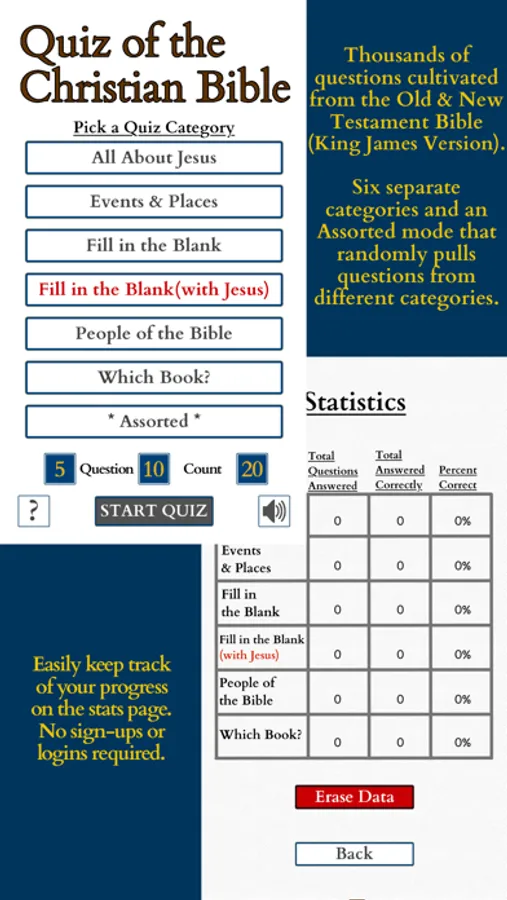 No sign-ups or logins required for using this Quiz of Christian Bible trivia app!