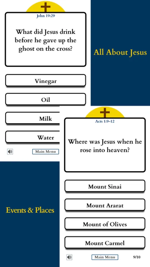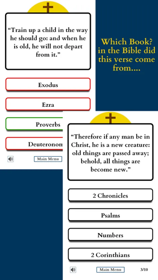 Which Book? - In this category, a bible verse will be shown for each question and your goal is to pick which book in the bible the verse came from. There are also some general questions about the books in the bible in this category as well.