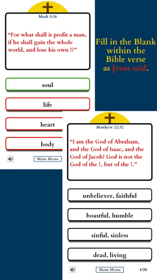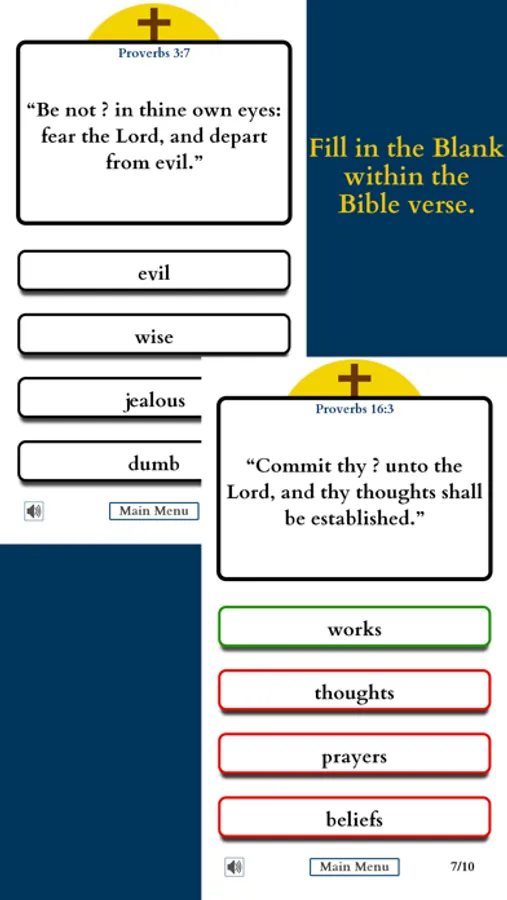 Fill in the Blank- This category presents bible verses from the Old & New Testament with one or more words missing. The goal of this category is to correctly pick the missing words.