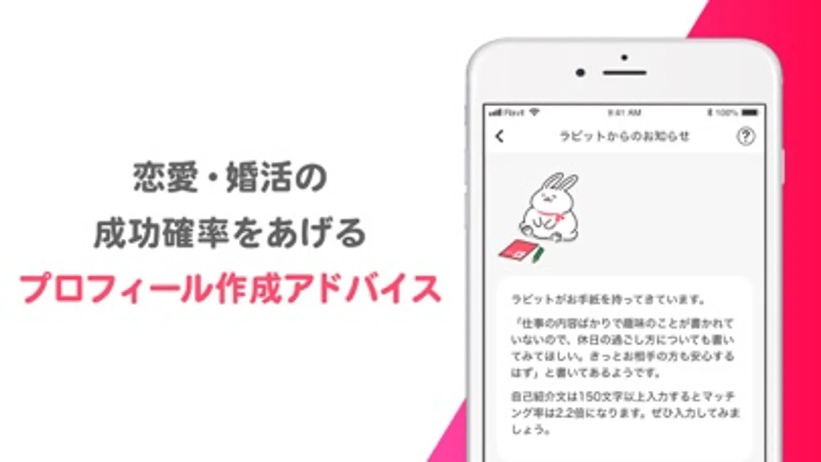 ・ラビットは、これまで蓄積されたデータに基づいて、恋愛・婚活の成功確率をあげるためのプロフィール作成のアドバイスを行います。