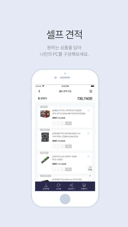 - 원하는 구성품을 담아 바로 확인할 수 있는 견적 서비스