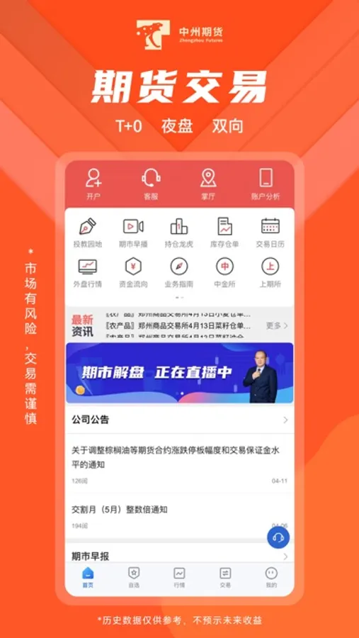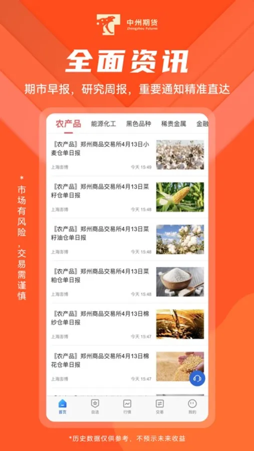 中州期货App,为您提供极速直达的实时行情,让您尊享掌上开户、期货交易、实时资讯等移动端综合金融服务,各类交易策略、研究报告应有尽有,您可以随时随地、方便快捷的享受我们提供的专业服务。