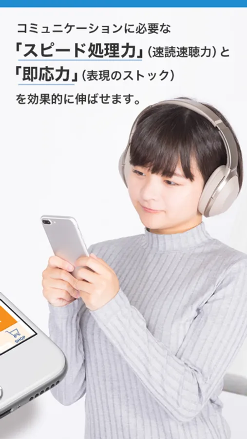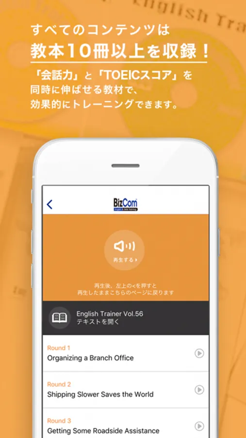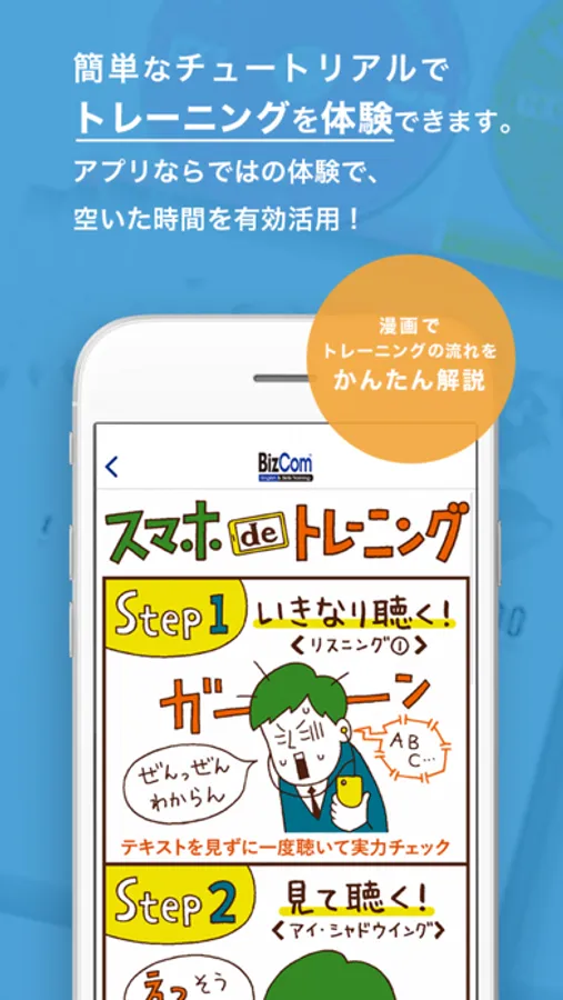 1回5分から出来る「スマホdeトレーニング」をマンガで解説。簡単なチュートリアルを使って、実際にトレーニングを体験できます。さらにビズコムの公式教材「English Trainer」がトレーニングし放題。通勤・通学時には音声だけでも学習でき、聞き取れなかった箇所をアプリでトレーニングできます。
