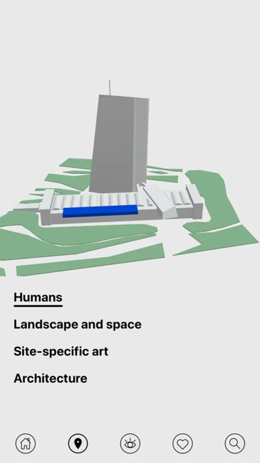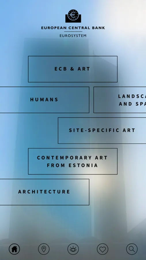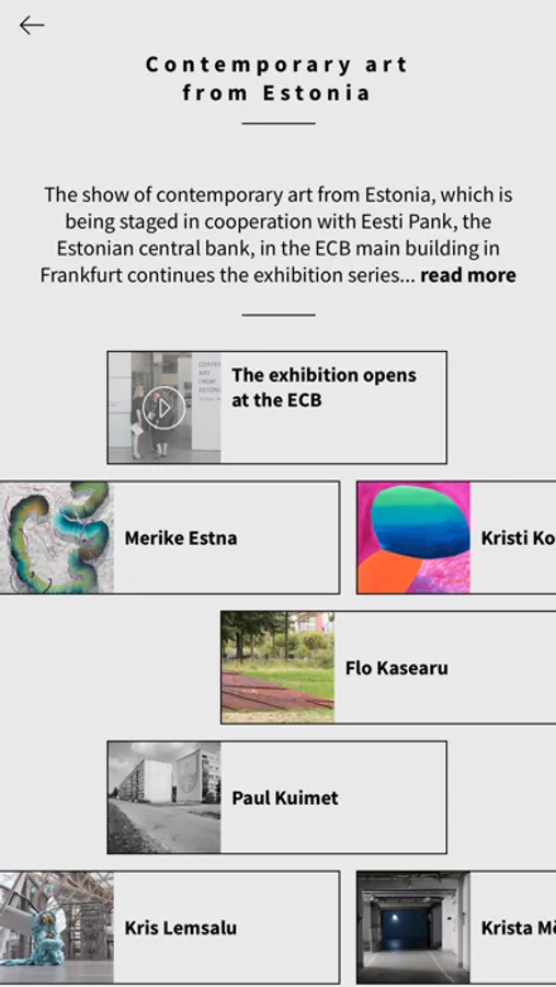 When using the ECB Art App at home, you can watch the high-quality app-exclusive multimedia content comfortably by streaming it on your Apple TV or Chromecast. Navigating the app is easy and intuitive; you can search for specific artists or simply browse the different artworks via the main menu topics “Humans”, “Landscape & space”, “Site-specific art”, “Contemporary art from Estonia” and "Contemporary art from Croatia".