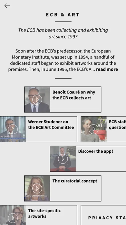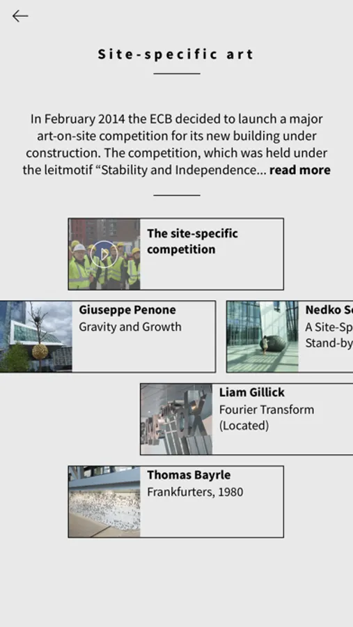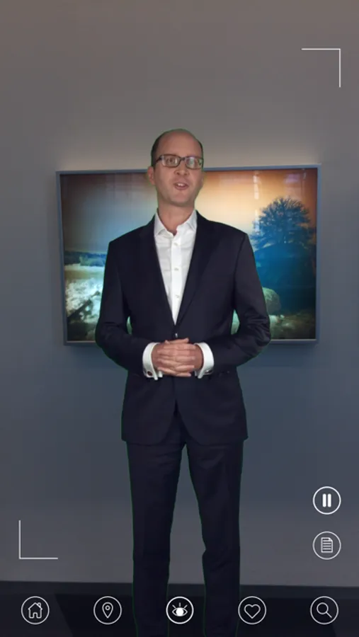 Onsite you can use the image recognition function to scan the artwork and instantly view an in-depth information page specific to that artwork. To further enhance the art experience, Augmented Reality has been added to some artworks. When scanning the artwork you may find that a member of the ECB Art Committee suddenly appears to describe his or her feelings about the artwork.