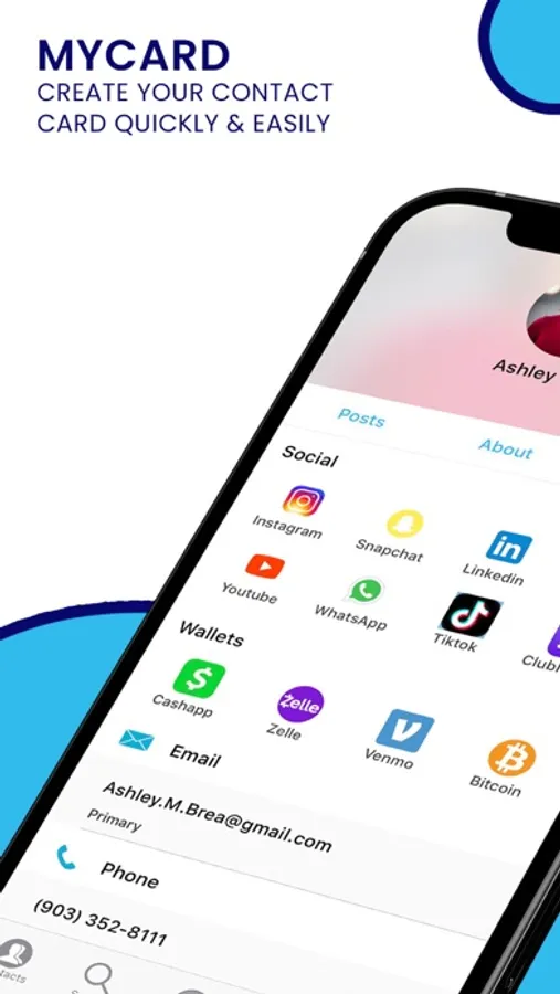 All your networking information is at your fingertips. Share your choice of contact information and relevant credentials, like social media handles, email addresses, phone numbers, websites, and more, plus find access to a digital wallet for sending or receiving payments safely and securely.