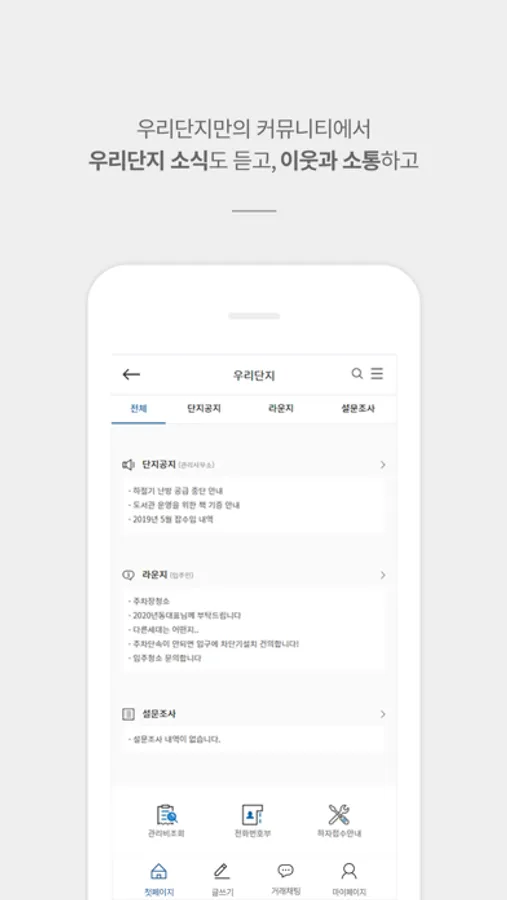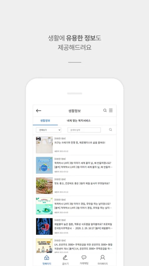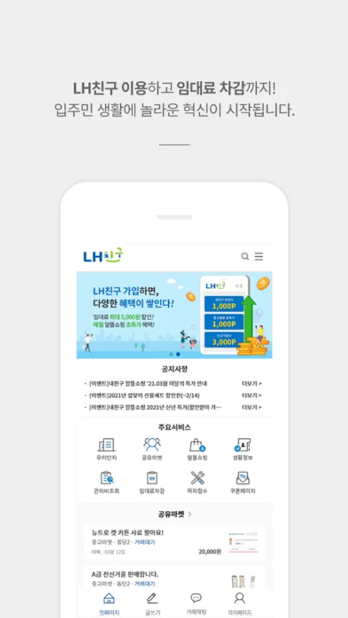 LH공사가 건설하고 관리하는 임대주택 입주민을 대상으로한 공유마켓, 알뜰쇼핑, 주거생활정보, 지역상권, 우리단지 등에 관한 정보 및 커뮤니티를 내친구 앱에서 확인하실 수 있습니다