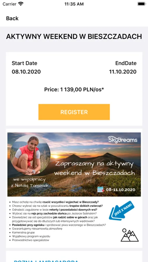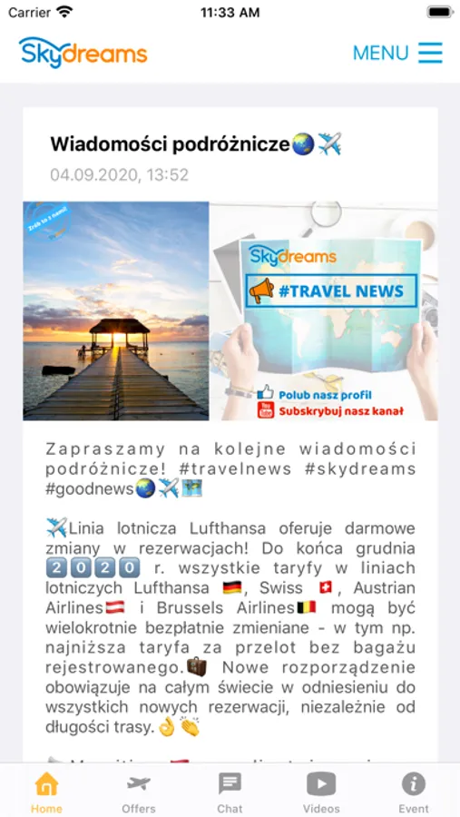 Sky Dreams Events app provides general information about our organisation, news from our office, movies, current events / trips organised by our company. Our main goal was to replace traditional paper marketing documents which we always provide to our client with digital content. Now you can check what is happening with your trip and get the most recent information about event.