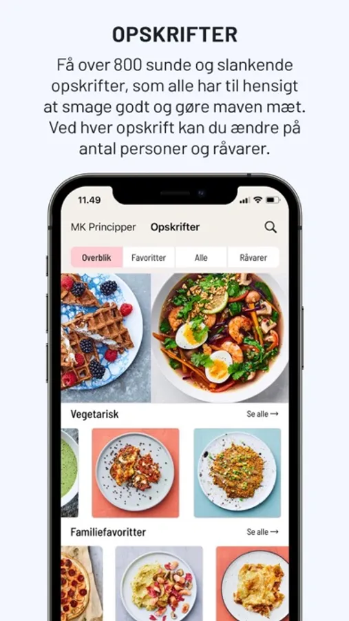 Vores mission er at drysse noget sundhed ned over din madlavning, så du får øjnene op for, at sund og slankende mad kan være yderst velsmagende, mætte godt og være simpelt at lave. Sundhed og vægttab handler nemlig ikke kun om fitness og den ene slankekur efter den anden. Mest af alt handler det om, at du skal knække koden til, hvad der virker for dig – og at du er glad for at være i din krop. Her betyder sund kost enormt meget! Appen indeholder mere end 85 gratis opskrifter, som er lavet ud fra MK principperne. Vi garanterer, at hver enkelt opskrift i MK Universet er lækker, let og hurtig at smække sammen. Du finder også mange andre opskrifter, som du kan tilkøbe.