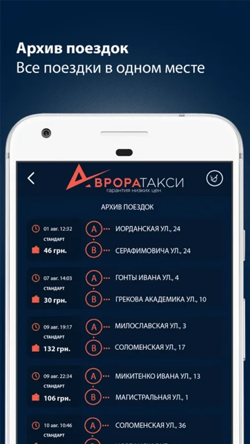 - Все совершенные поездки сохраняются в архиве с возможностью выбрать и повторить;
