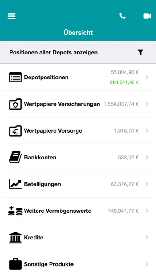 - Konsolidierte Vermögensübersicht inkl. aller Fondsanteile, Versicherungen, Beteiligungen und Bankkonten