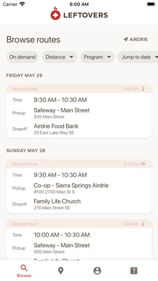 Using this app, volunteers are able to sign up to join Leftovers, sign up for available routes, keep track of their upcoming routes, view a map guiding them to the pick up and drop off locations, and submit route information upon completion. The app also calculates a score based on how much volunteering each user has done, allowing you to compete with friends as you help your community!
