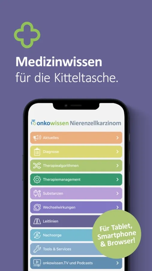 Die App onkowissen Nierenzellkarzinom bietet Ihnen einen schnellen, einfachen und aktuellen Zugang zu umfangreichen, praxisrelevanten Informationen zur Diagnose und Behandlung des Nierenzellkarzinoms.