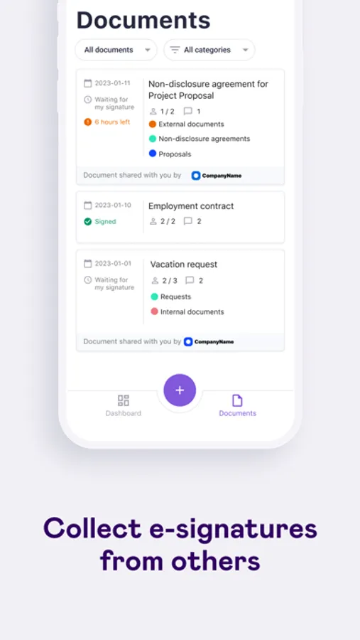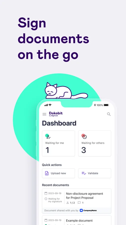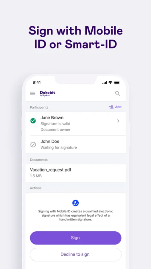 Signing documents from your phone or tablet has never been so easy. Dokobit app allows you to sign legally binding documents with Mobile ID or Smart-ID, effortlessly share documents, collect signatures from others and track signing progress anywhere, anytime. Dokobit is an easy-to-use tool where your documents are organised and accessible wherever you are.