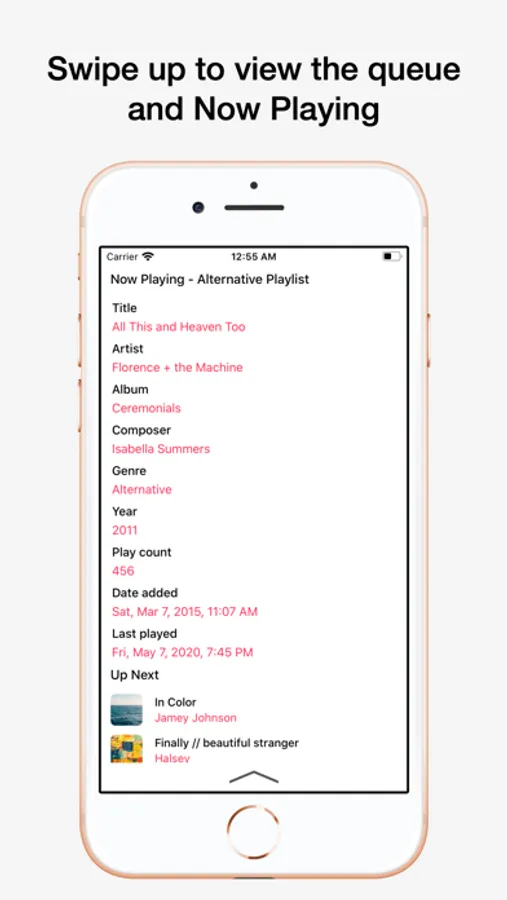 - Swipe up to view the current queue, as well as info about the currently playing song