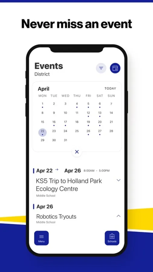 The event section shows a list of events throughout the district. Users can add an event to their calendar to share the event with friends and family with one tap.