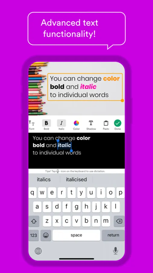 • Include full functionality including standard shapes, colors and fonts of the app will be available during the subscription period