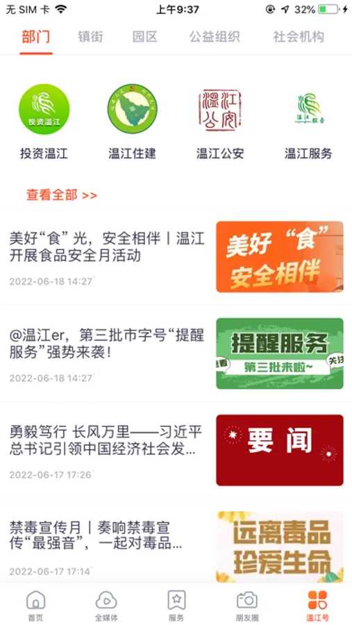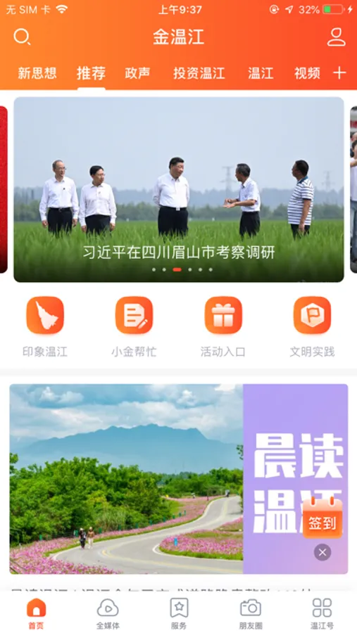 金温江app是由成都市温江区融媒体中心打造的新闻综合类客户端,包含了首页、全媒体、服务、随手拍、温江号五个一级栏目,聚合本地权威资讯、便捷办理查询多种政务事项、展示温江人的日常生活。