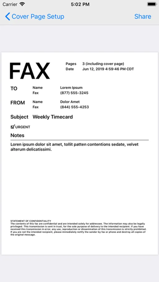 Includes built-in disclaimers for optional confidential information and HIPAA compliance statements at the bottom of your fax cover sheet.