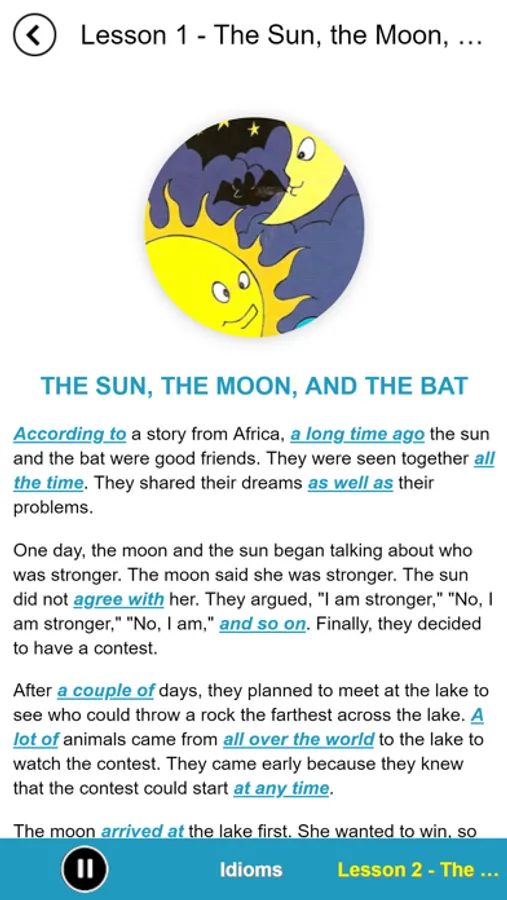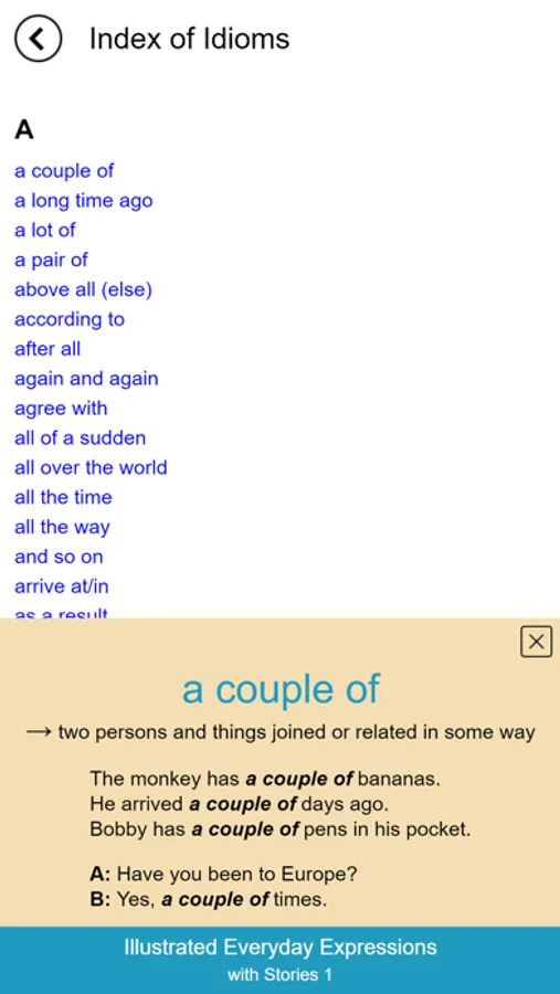 Each lesson of this book begins with a list of twenty target idioms. The idioms are arranged alphabetically throughout the book to help students reference the idioms for later use. After completing all the units in the book, students may continue to use Illustrated Everyday Expressions with Stories series as a humorous illustrated dictionary of common idioms.