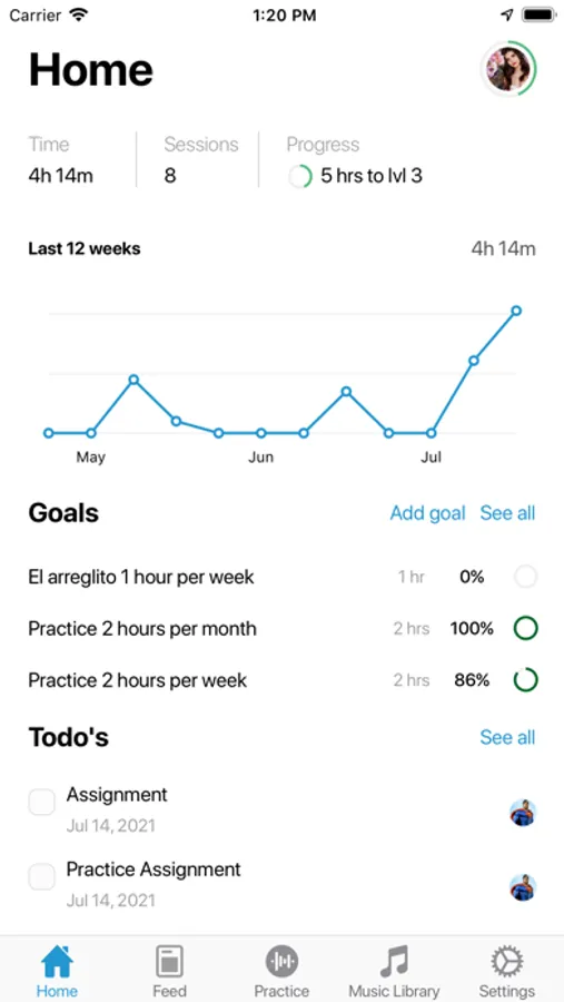 See how much you practice each day or week, set goals, ask for help if you get stuck, and join a community of thousands of other musicians learning together.