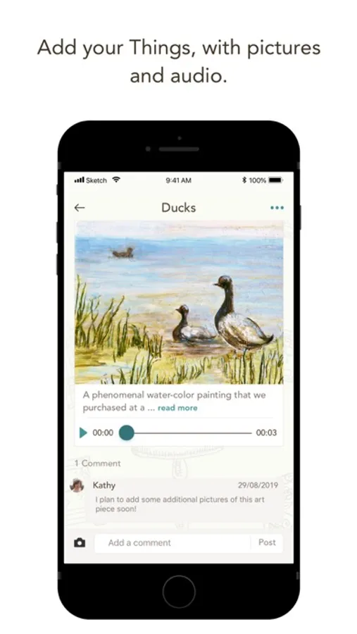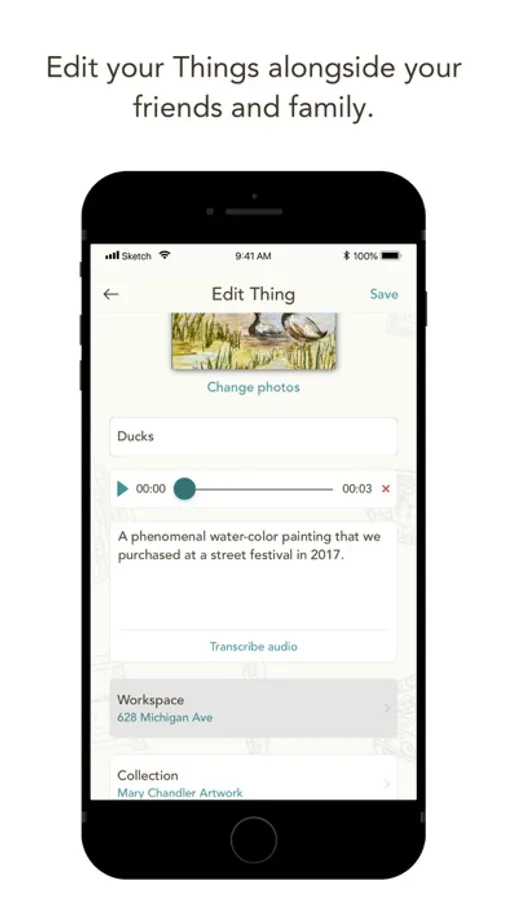 • Assign these recorded stories now known as “Things” to “Collections”. Example collections can include furniture, medals, heirlooms, letters, sports memorability, clocks, children’s artwork, paintings, china, record albums, photos.