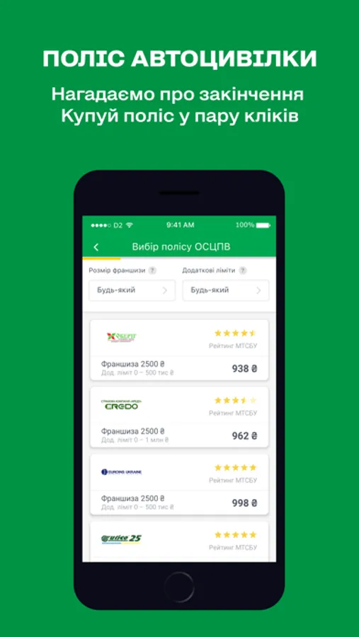 • Автоцивілка онлайн. Можливість швидко та зручно купити страховку на авто. Вибір серед декількох страхових компаній, можливість обрати додаткові параметри страхування. Нагадаємо про закінчення діючої страховки.