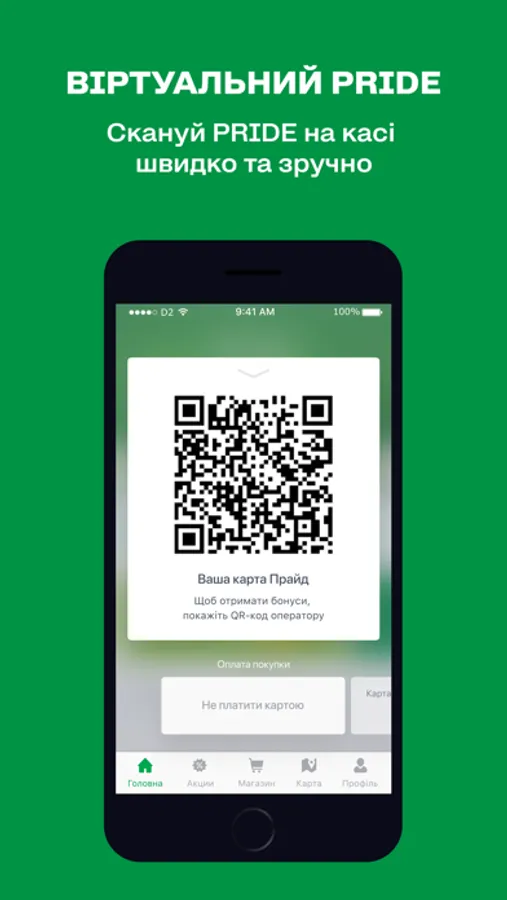 • Платіжна картка разом з ПРАЙД. Скануйте QR код ПРАЙД разом з платіжною карткою та одразу сплачуйте за замовлення
