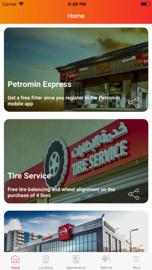 The Petromin app comes with a variety of features including a view of the latest offers across all of our businesses, a full-fledged station locator for all Petromin outlets (including Petromin Express, Petromin Auto Care, Fuel stations, Primo convenience store, and Nissan showrooms), maintenance history access for Petromin Express and Auto Care, and a Refer a Friend benefit scheme!