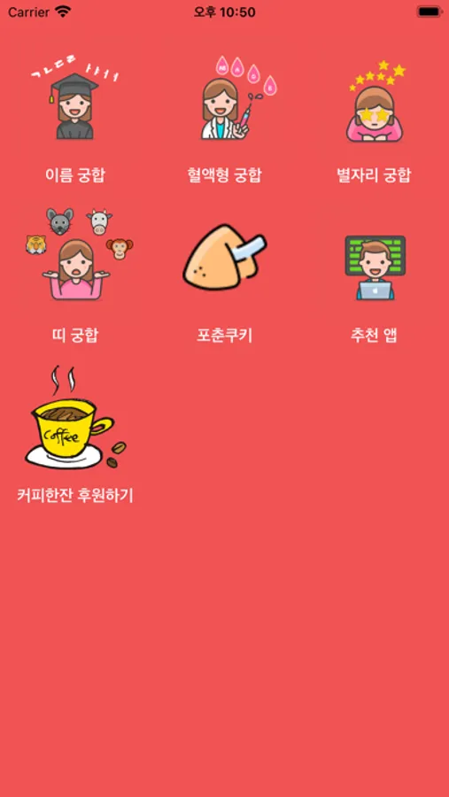 이름궁합, 혈액형궁합 ,별자리궁합 ,띠궁합, 포춘쿠키가 모두 무료로 제공되고 있습니다.