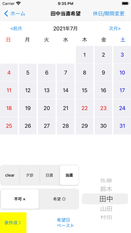 3. 当直表作成:画面右下のピッカーから医師名を選択し、各医師の希望日・不可能日をカレンダーに入力します。すべての医師の希望日・不可能日を入力したら「表作成!」ボタンを押します。すると瞬時に当直表が作成されます。