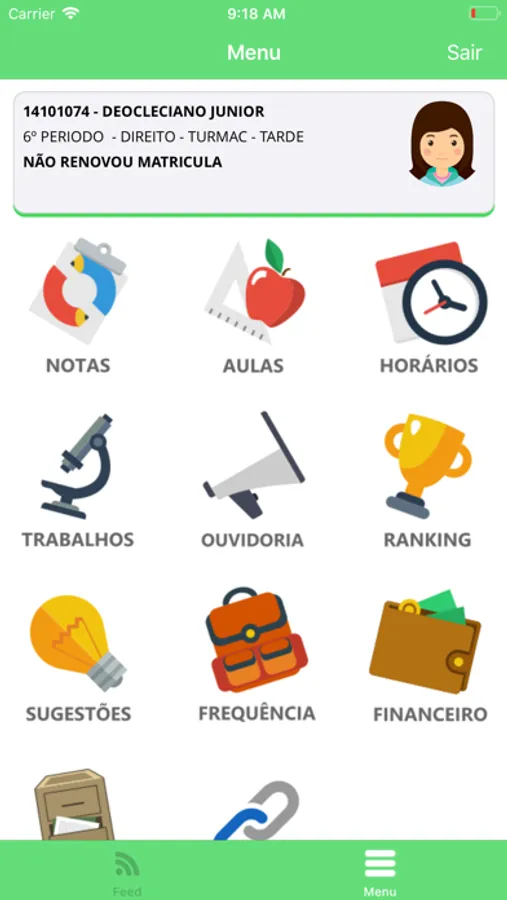 Feed, onde a instituição postara novidades, avisos e noticias importantes. Notas por semestre e disciplinas, aulas com datas e conteúdos, horários de aulas, trabalhos, financeiro, protocolo e muito mais, tudo na palma da mão.