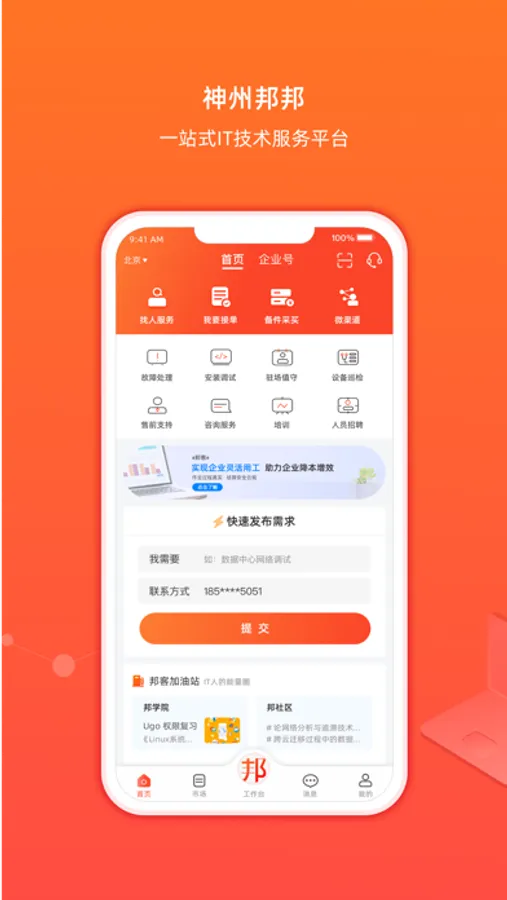 通过神州邦邦,用户可发布需求,系统根据需求的技术方向和地域,快捷方便地帮助用户找到优质工程师、服务商提供IT服务,简单高效的选择模式和沟通方式让企业用户不必在“茫茫人海中寻寻觅觅”,轻松即可获得可靠且实惠的IT服务;