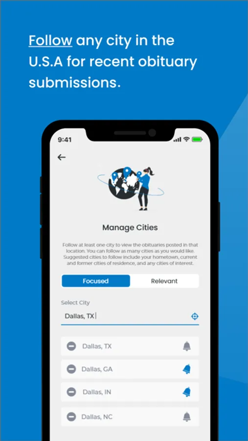 There are two obituary feeds within The Obituary App. Users can save multiple cities in either feed in the menu section labeled “Manage Cities”. Users must follow at least one city in a feed to populate obituaries.