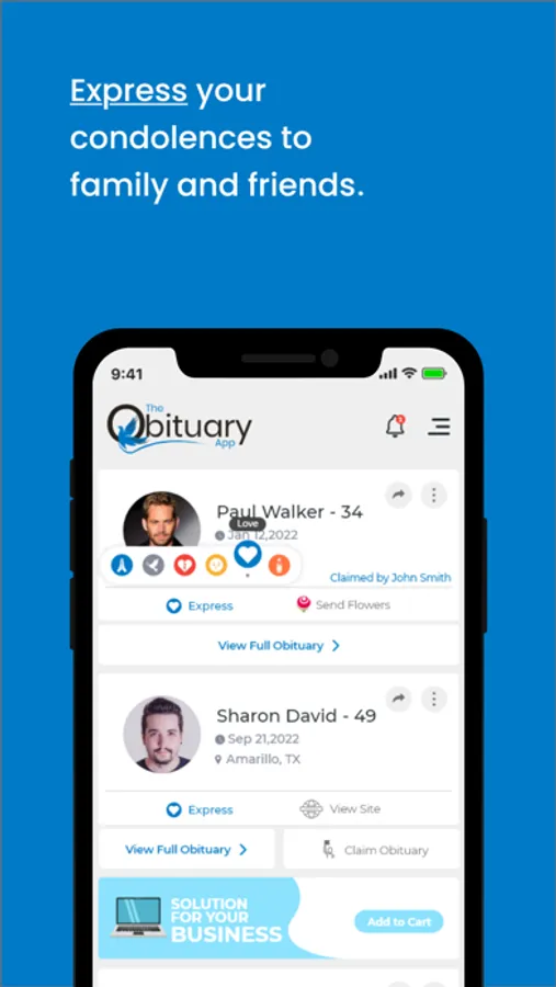 A feed consists of Obituary cards, similar to a drivers license; An obit card consists of the decedent's name, photo and age (if available), the city in which the death took place, and multiple functions for the user. A user can express condolences, send flowers through the funeral home website, view the full obituary, share through email or social media, save to one's own personal memory wall, indicate an intention of attending the funeral or memorial service, or report the obituary for misinformation.
